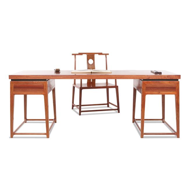 「末明」系列之办公桌,秉承明式家具风格,却将原本外圆内方的设计改成外方内圆,使之拥有了更具现代感的线条,书案板面宽度与架几相当,以传统攒框装芯之法打造,为了顺应木料的自然特性,在框与芯之间留有细缝,让木头可以自由地呼吸。书案面板轻搁几上,架几分别安有抽屉,存放文房器物。 |